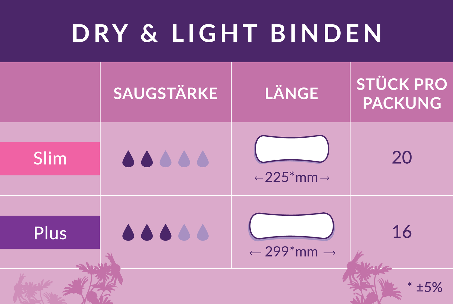 Die Dry & Light Slim Inkontinenzeinlagen haben einen Kern aus weichem, komprimiertem Zellstoff, der leichten Urinverlust effektiv absorbiert und zuverlässigen Schutz bietet – ganz ohne ölbasierte Kunststoffe und aggressive Chemikalien. Sie sind ohne Flügel hergestellt und haben einen Klebestreifen, der die Einlagen sicher fixiert.