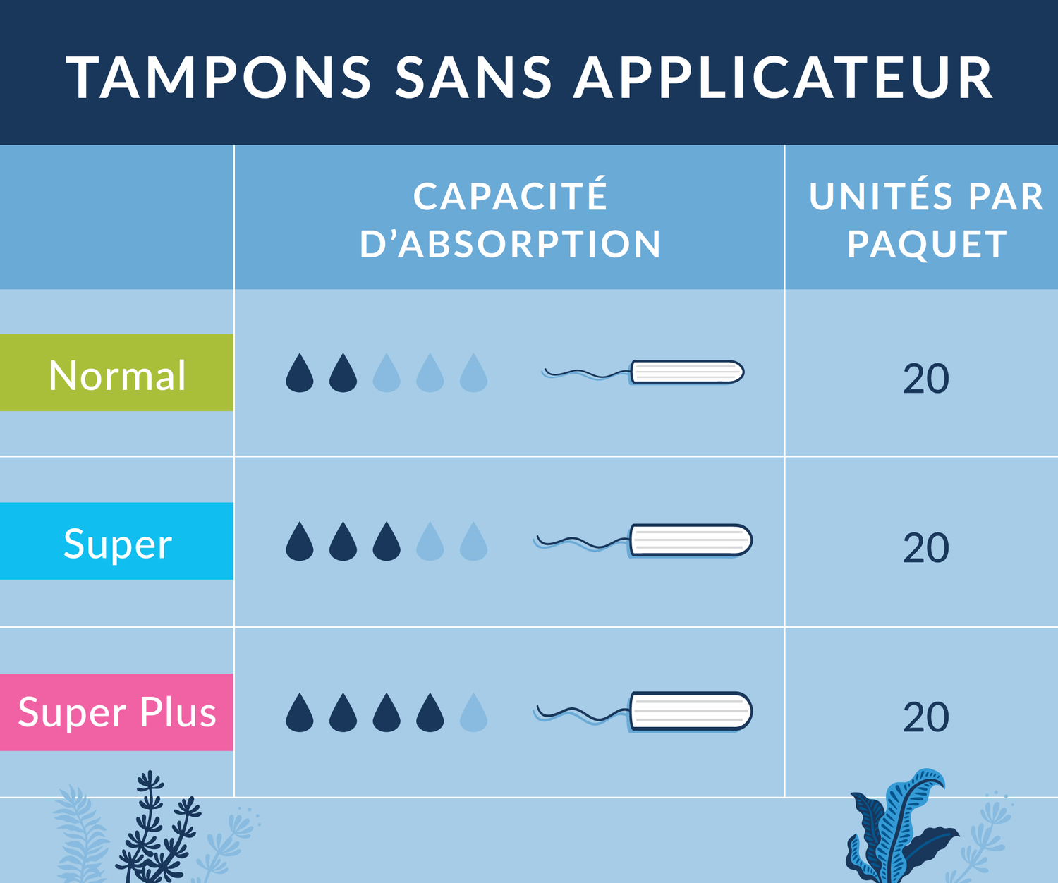 Les tampons sans applicateur natracare sont fabriqués à partir de coton biologique certifié GOTS à 100 %. Choisissez parmi les niveaux d'absorption Regular, Super ou Super Plus en fonction de votre flux.